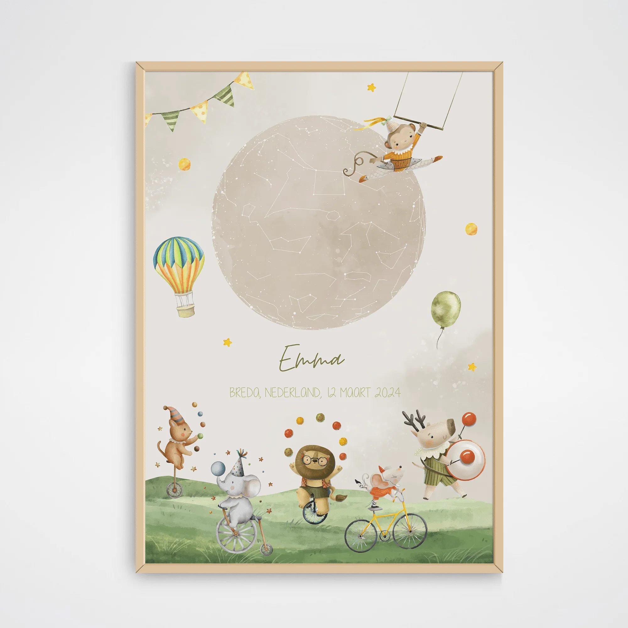 Verrijk de babykamer met een gepersonaliseerde sterrenhemel geboorteposter in het thema ‘Circus Dieren’.