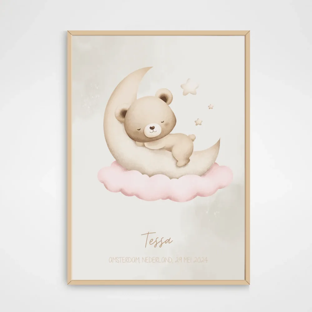 Ontdek deze schattige poster met een lief beertje, perfect voor de kinderkamer van kleine meisjes! De poster toont een dromerig beertje op de maan. Met zachte kleuren en het knuffelbare beertje als centraal figuur, brengt deze poster een gevoel van geborgenheid en plezier in elke baby- of kinderkamer. Ideaal om op te hangen en zo een nieuwe, vertrouwde vriend toe te voegen aan het dagelijkse leven van je kleintje.