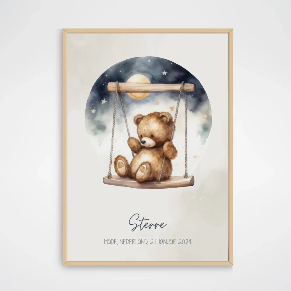 Geef de kinderkamer een dromerige touch met deze lieve maan poster! Deze poster toont een schattig beertje bij de maan, wat warmte en magie uitstraalt. Perfect voor jonge avonturiers en dromers, en een schitterende toevoeging aan elke kinderkamer. Personaliseer de poster met naam, geboortedatum en een speciaal bericht om een unieke herinnering te creëren aan een onvergetelijk moment. Deze poster is niet alleen een stijlvolle decoratie, maar ook een blijvende herinnering vol liefde en verbeeldingskracht.