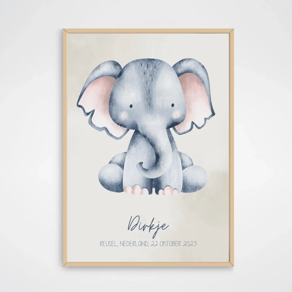 Voeg een lieve en speelse touch toe aan de kinderkamer met deze schattige olifantenposter! De poster toont een vrolijk olifantje, altijd klaar om je kleintje te vergezellen tijdens dromerige avonturen. Maak de poster uniek door hem te personaliseren met naam, geboortedatum en plaats, zodat het een persoonlijke en waardevolle decoratie wordt voor je kind.