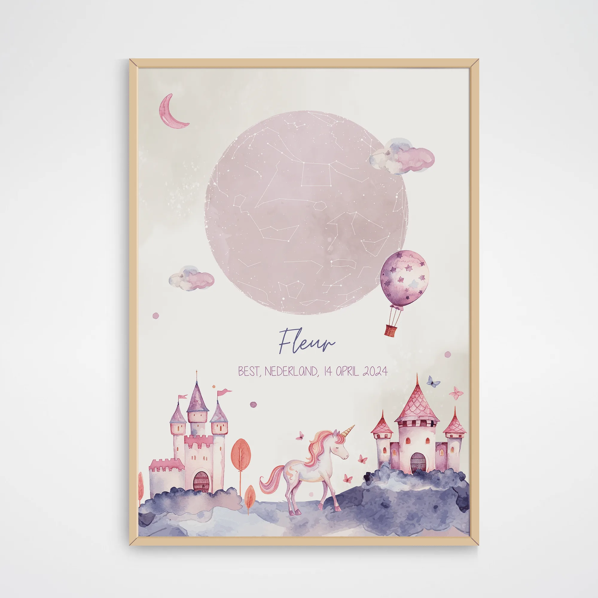 Verrijk de babykamer met een gepersonaliseerde roze sterrenhemel poster in het thema ‘Prinsessen wereld’.