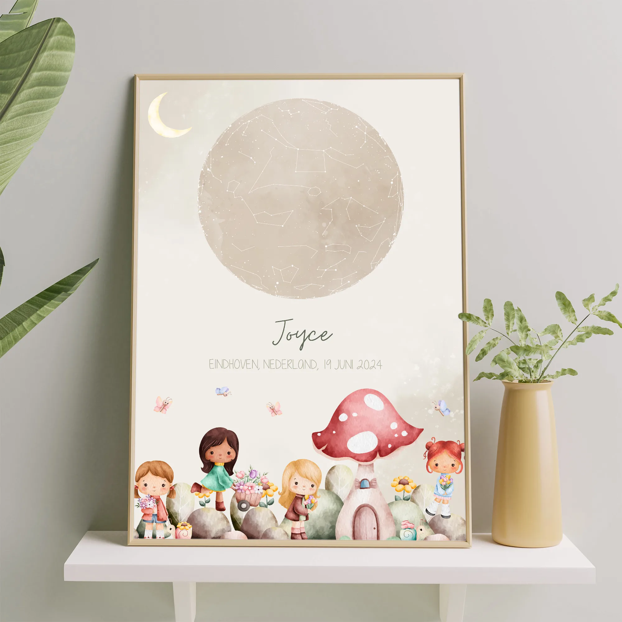 Creëer een magische herinnering voor je kind met een gepersonaliseerde sterrenhemel poster! Deze unieke posters brengen de nacht waarin je kindje werd geboren tot leven, met een gedetailleerde sterrenhemel zoals die op dat moment te zien was. Kies uit diverse dromerige thema’s die perfect passen bij elke kinderkamer: van sprookjesachtige elfjes en zeemeerminnen tot koninklijke prinsessen, en schattige bos-, jungle- en boerderijdieren. Elke poster kan worden gepersonaliseerd met naam, geboortedatum en locatie, en is een prachtige decoratie én blijvende herinnering aan een bijzonder moment.