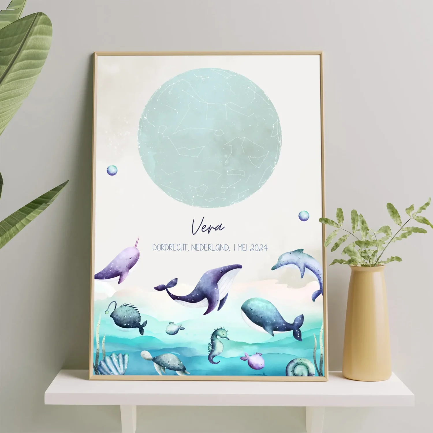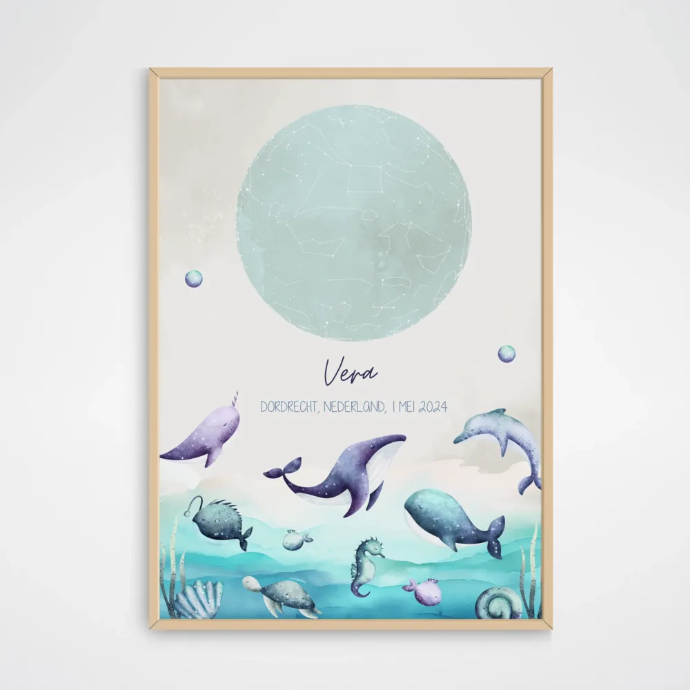 Creëer een magische herinnering voor je kind met een gepersonaliseerde sterrenhemel poster in het thema oceaandieren! Deze unieke posters brengen de nacht waarin je kindje werd geboren tot leven, met een gedetailleerde sterrenhemel zoals die op dat moment te zien was. Kies uit diverse dromerige thema’s die perfect passen bij elke kinderkamer: van sprookjesachtige elfjes en zeemeerminnen tot koninklijke prinsessen, en schattige bos-, jungle- en boerderijdieren. Elke poster kan worden gepersonaliseerd met naam, geboortedatum en locatie, en is een prachtige decoratie én blijvende herinnering aan een bijzonder moment.